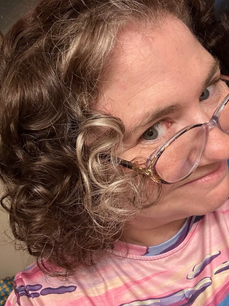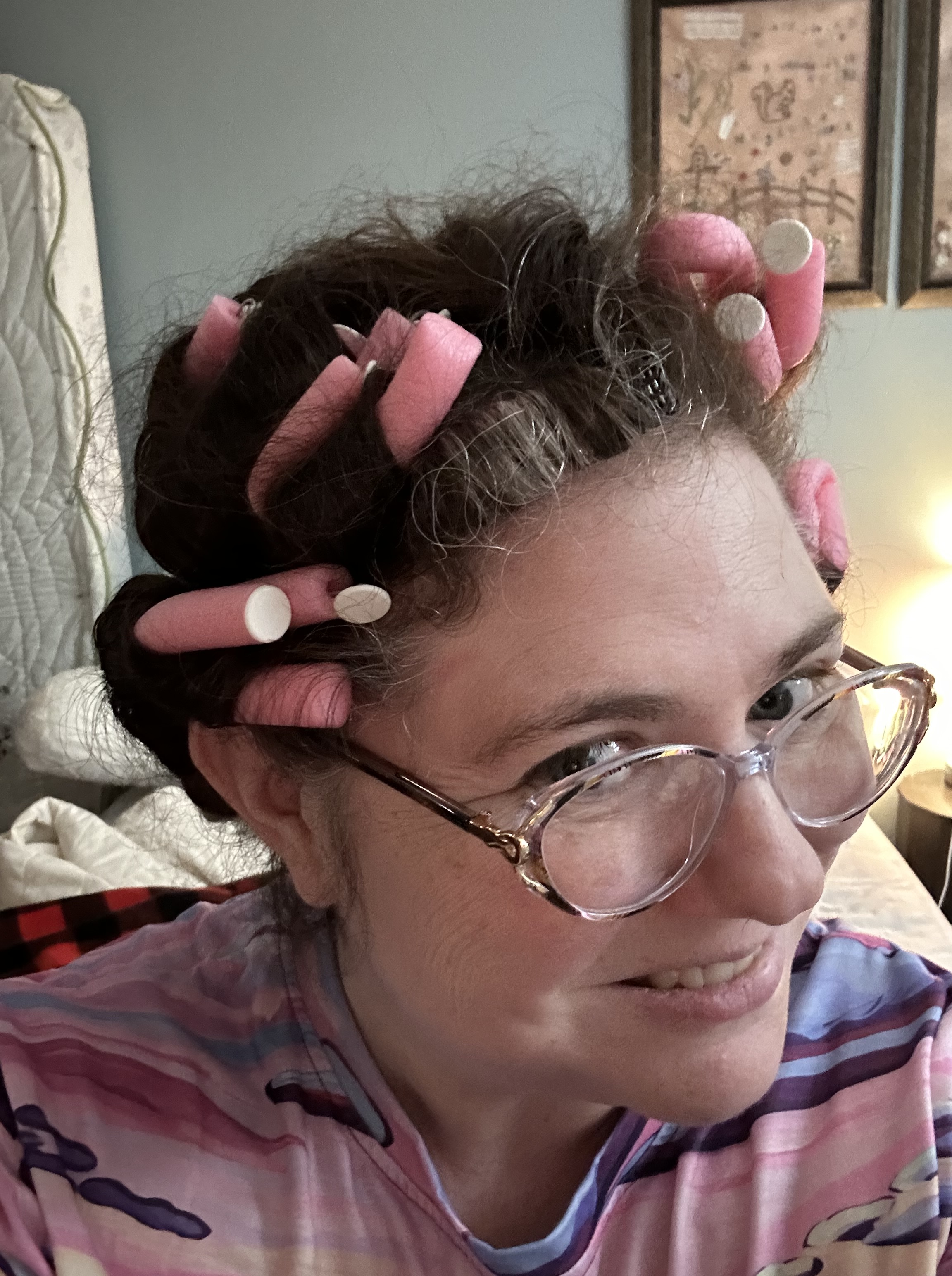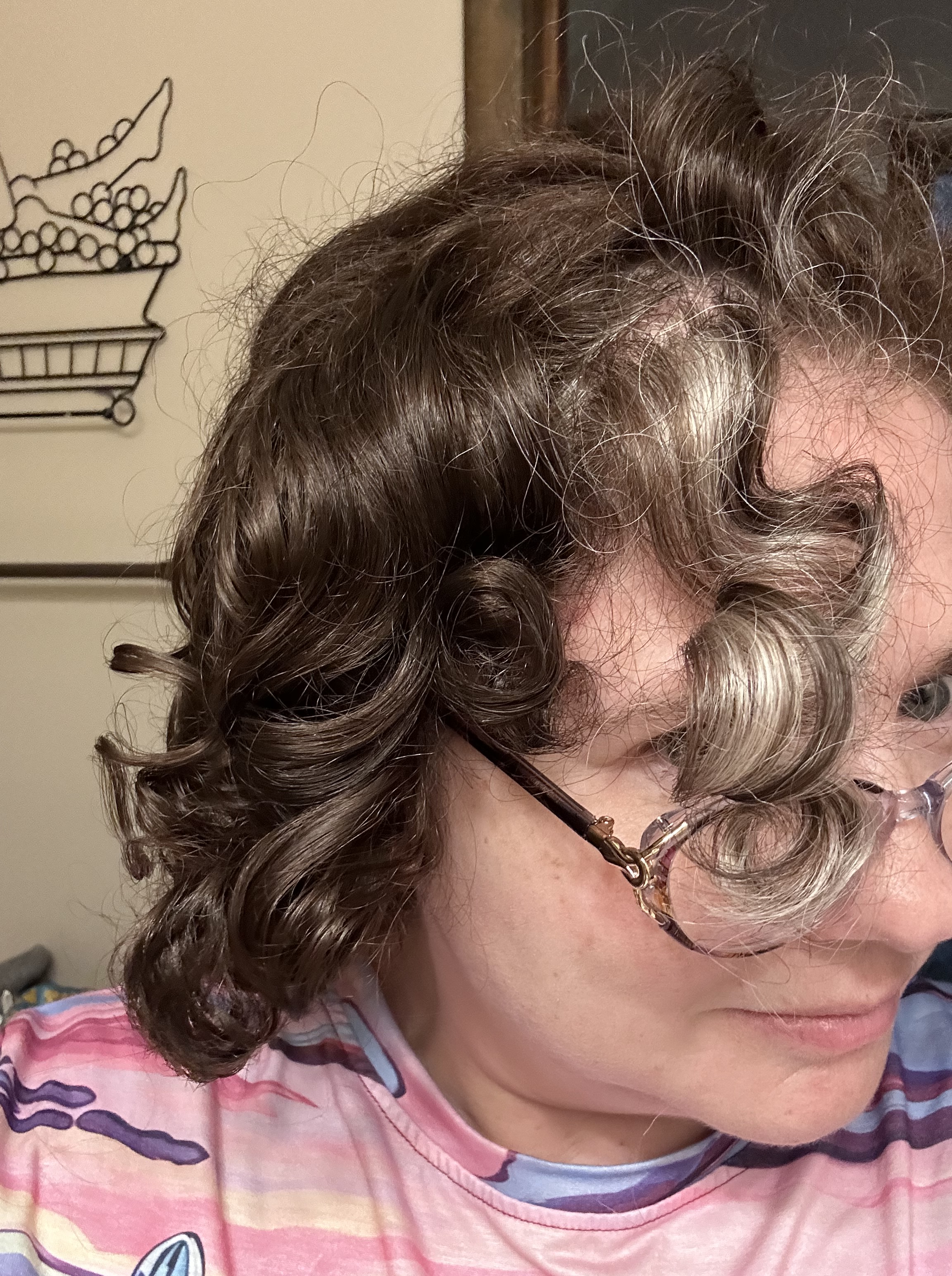 To solve this problem, mom and I (well, mostly mom) curled my hair. We put in soft curlers that would hold my hair as a I slept. I was expecting some loose curls or waves. I was completely surprised at the amount of curl I was able to achieve. Shirley Temple (I’m that old) has nothing over me.